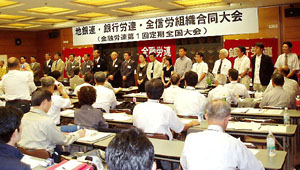 全信労と銀行労連は9月16〜17日、地銀連は9月16日、それぞれ大会を開き、昨年来準備をすすめてきた三単産の組織合同を承認しました。 これを受けて17日午後から18日まで日本青年館で「地銀連・銀行労連・全信労組織合同大会(金融労連第1回定期全国大会)」を開き、62単組・5000人で金融労連をスタートさせました。大会には、各単産の代議員65名、本部役員30名、オブザーバー28名の合計123名が参加しました。